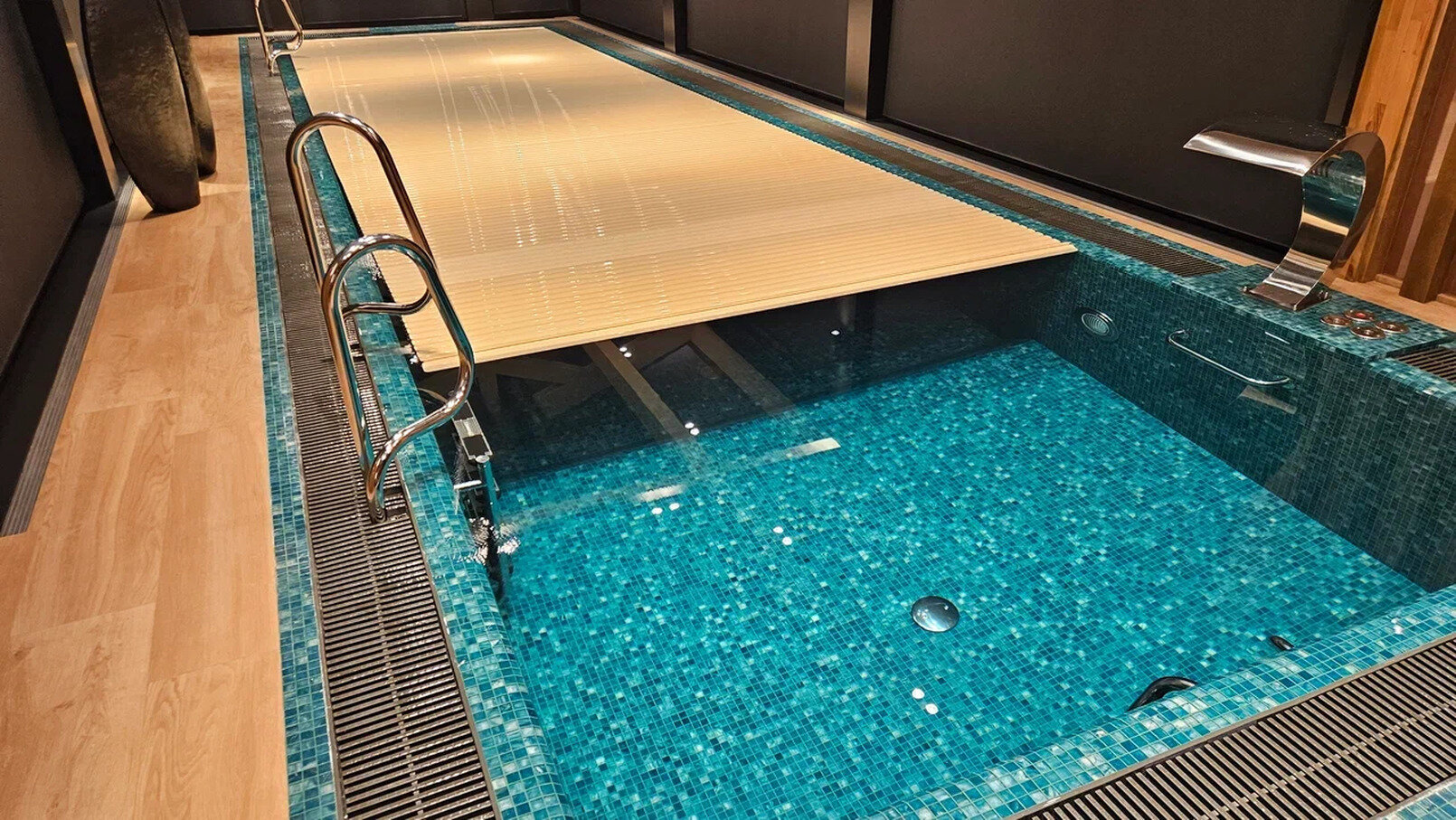 Автоматические жалюзи (на фото ниже) интегрированы в бассейн в 2019 году. Пять зимних сезонов эксплуатации показали, что автоматические плавающие жалюзи отлично подходят для работы в нашей климатической зоне и устойчивы к резким перепадам температур.